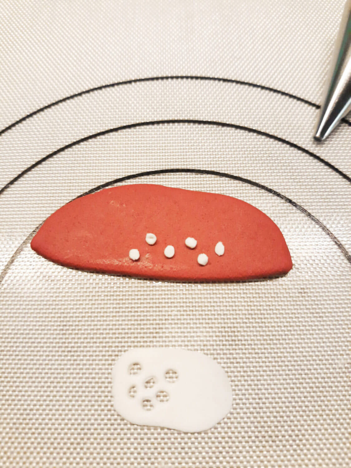 6. Ułóż kropki na czerwonej masie i rozwałkuj.